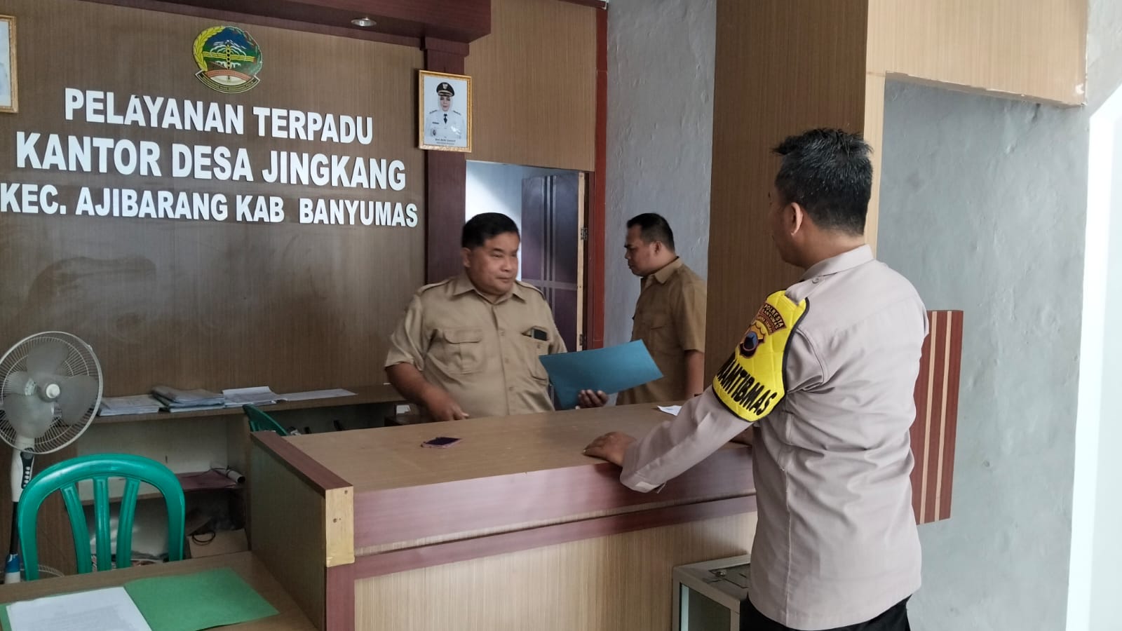Bhabinkamtibmas Polsek Ajibarang, Aipda Maskhuri, melaksanakan kegiatan sambang dan tatap muka dengan perangkat Desa Jingkang di Balai Desa Jingkang, Kecamatan Ajibarang, Senin (16/3/2026).