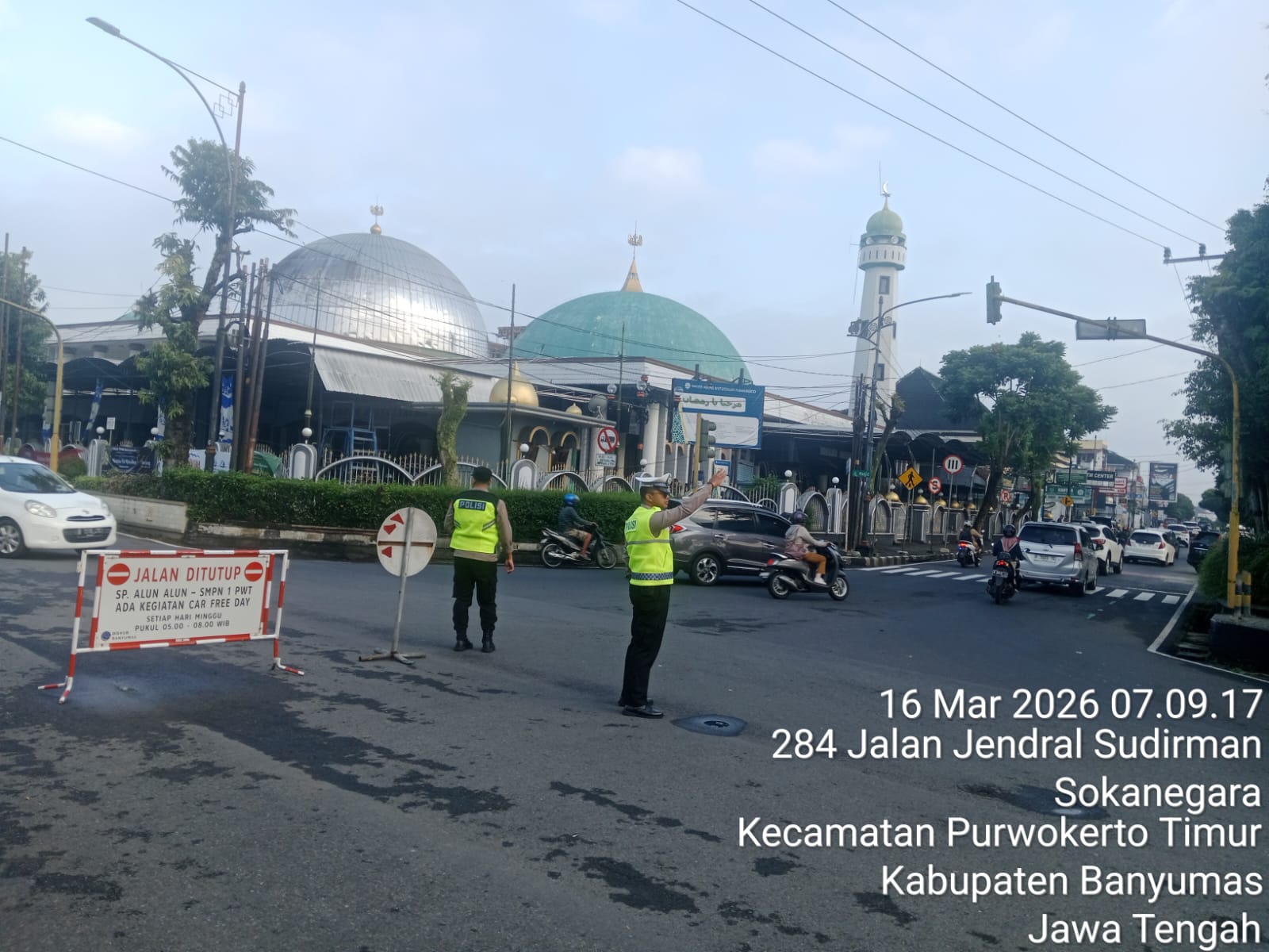 Personel Pos Terpadu di kawasan Alun-Alun Purwokerto melaksanakan kegiatan pengaturan lalu lintas da