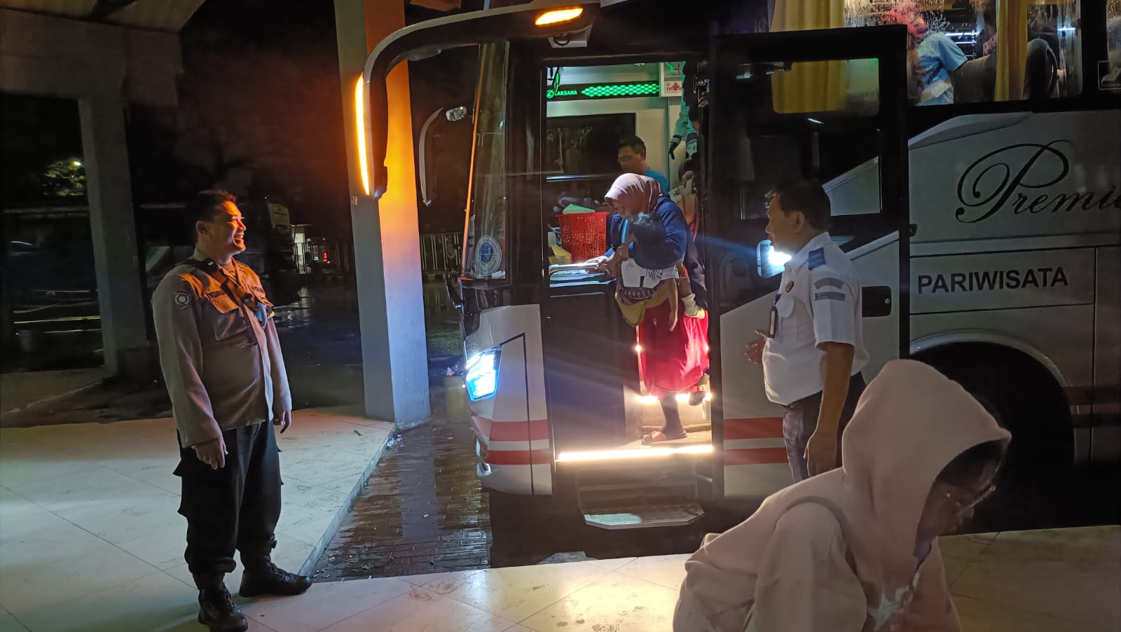 Petugas Pos Pelayanan Terminal Bus Bulupitu Purwokerto melaksanakan patroli dan pengamanan di area t